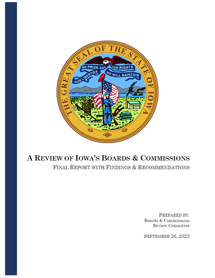 The Iowa Boards and Commissions Review Committee has published its final report offering recommendations to remove gender-balance requirements for board members, eliminate certain professional continuing education obligations and consolidate or remove more than 100 boards and commissions.